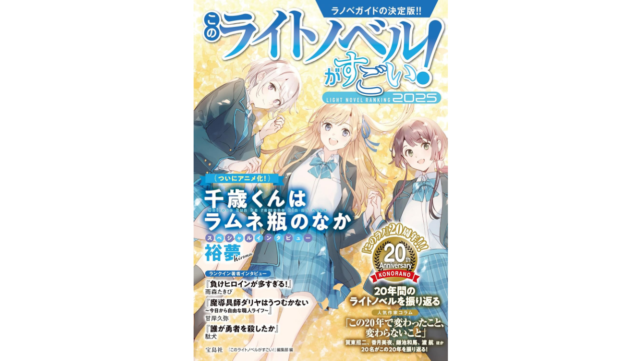 このライトノベルがすごい! 2025 ライトノベル 2026.01.122026.01.20 文庫本上位10作品リスト 1雨森たきび負けヒロインが多すぎる!ガガガ文庫シリーズリスト2駄犬誰が勇者を殺したか角川スニーカー文庫シリーズリスト3燦々SUN時々ボソッとロシア語でデレる隣のアーリャさん角川スニーカー文庫シリーズリスト4逢縁奇演こちら、終末停滞委員会。電撃文庫シリーズリスト5佐伯さんお隣の天使様にいつの間にか駄目人間にされていた件GA文庫シリーズリスト6犬村小六白き帝国ガガガ文庫シリーズリスト7森日向この物語を君に捧ぐ講談社ラノベ文庫シリーズリスト8三河ごーすと義妹生活MF文庫Jシリーズリスト9長山久竜星が果てても君は鳴れ電撃文庫シリーズリスト10赤城大空【悲報】お嬢様系底辺ダンジョン配信者、配信切り忘れに気づかず同業者をボコってしまうガガガ文庫シリーズリスト 単行本上位10作品リスト 1甘岸久弥魔導具師ダリヤはうつむかないMFブックスシリーズリスト2十夜転生した大聖女は、聖女であることをひた隠すアース・スターノベルシリーズリスト3十夜悪役令嬢は溺愛ルートに入りました!?SQEXノベルシリーズリスト4坂石遊作魔法使いの引っ越し屋カドカワBOOKSシリーズリスト5永野水貴恋した人は、妹の代わりに死んでくれと言った。TOブックスシリーズリスト6槻影嘆きの亡霊は引退したいGCノベルズシリーズリスト7雨川透子ループ7回目の悪役令嬢は、元敵国で自由気ままな花嫁生活を満喫するオーバーラップノベルスfシリーズリスト8めぐすり引きこもりVTuberは伝えたい電撃の新文芸シリーズリスト9伏瀬転生したらスライムだった件GCノベルズシリーズリスト10逢沢大介陰の実力者になりたくて!KADOKAWAシリーズリスト